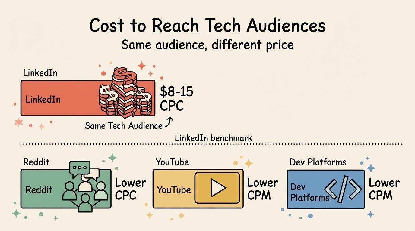 LinkedIn is the default for B2B tech marketing. It is also the most expensive social ad platform per click. When your audience is developers, engineers, DevOps leads, or IT decision-makers, LinkedIn CPCs can run $8-$15 per click. At those rates, even a modest campaign burns through budget fast. The good news: technical audiences are highly active on platforms where advertising costs a fraction of LinkedIn.